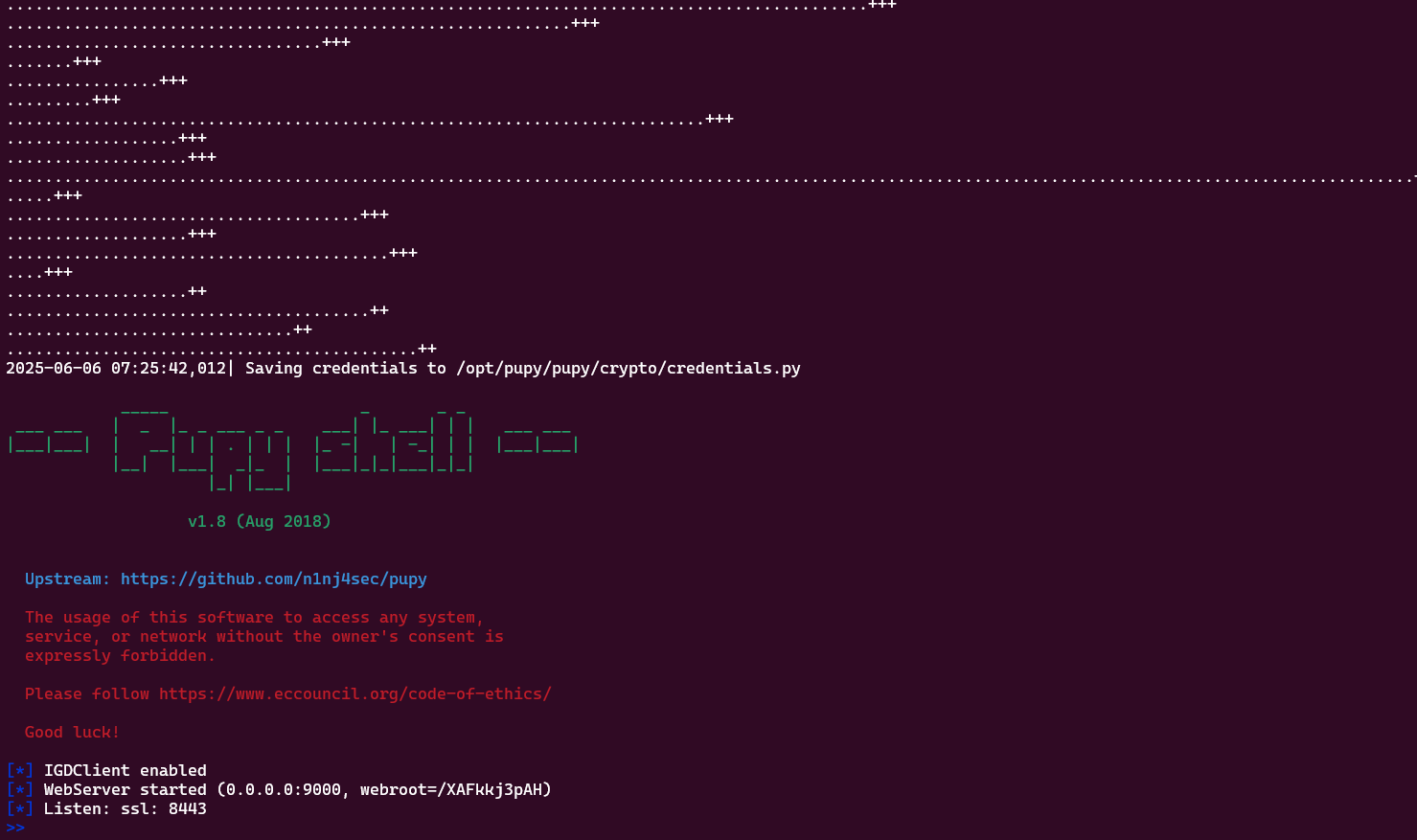 $ docker run --rm -it -p 1234:1234 -v "/opt/payloads:/tmp/payloads" docker-pupy python pupysh.py