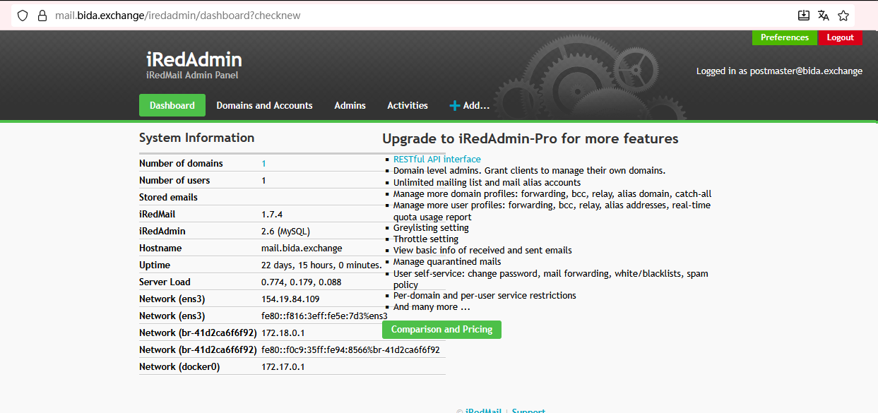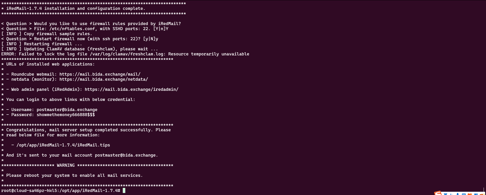 * Additional components: Roundcubemail netdata iRedAdmin Fail2ban