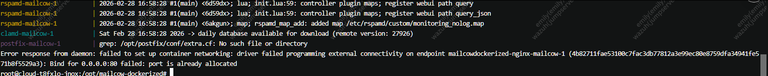 Error response from daemon: failed to set up container networking: driver failed programming external connectivity on endpoint mailcowdockerized-nginx-mailcow-1 (4b82711fae53100c7fac3db77812a3e99ec80e8759dfa34941fe571b8f5529a3): Bind for 0.0.0.0:80 failed: port is already allocated