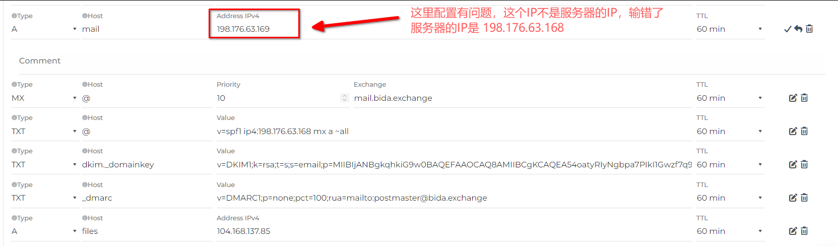 打开 mailcow 找到域名的配置,在里面查看 DNS 记录,可以看到第一个 A 类型存在问题