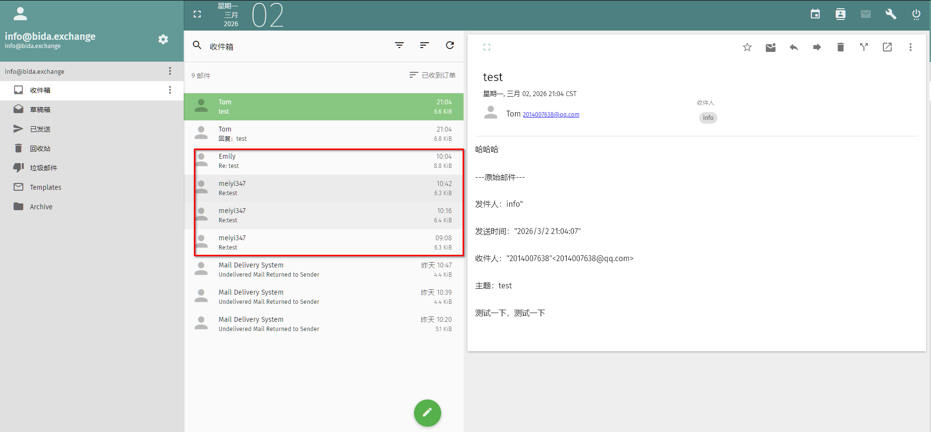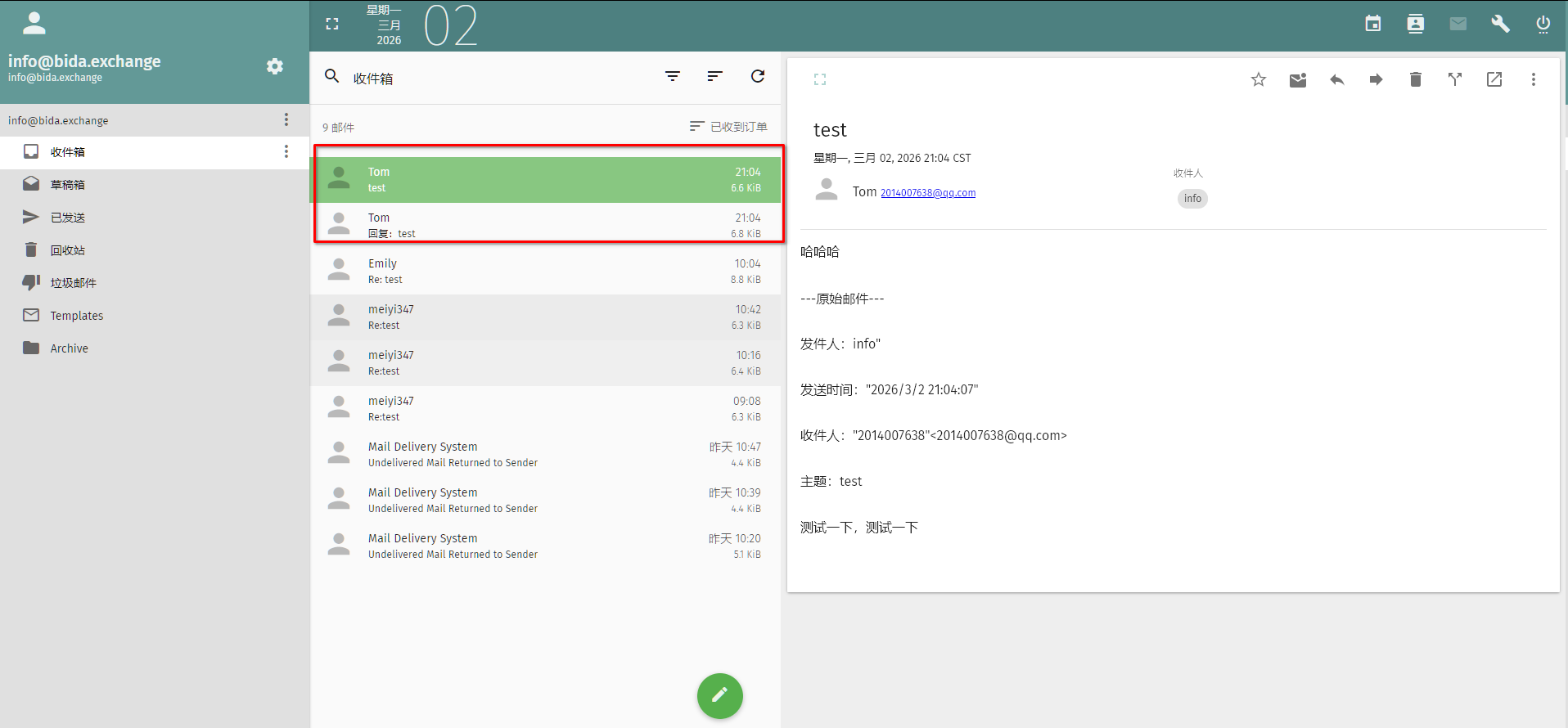 再尝试使用qq、gmail、网易等邮箱给 mailcow 发送邮件,就可以发现可以正常接收邮件了